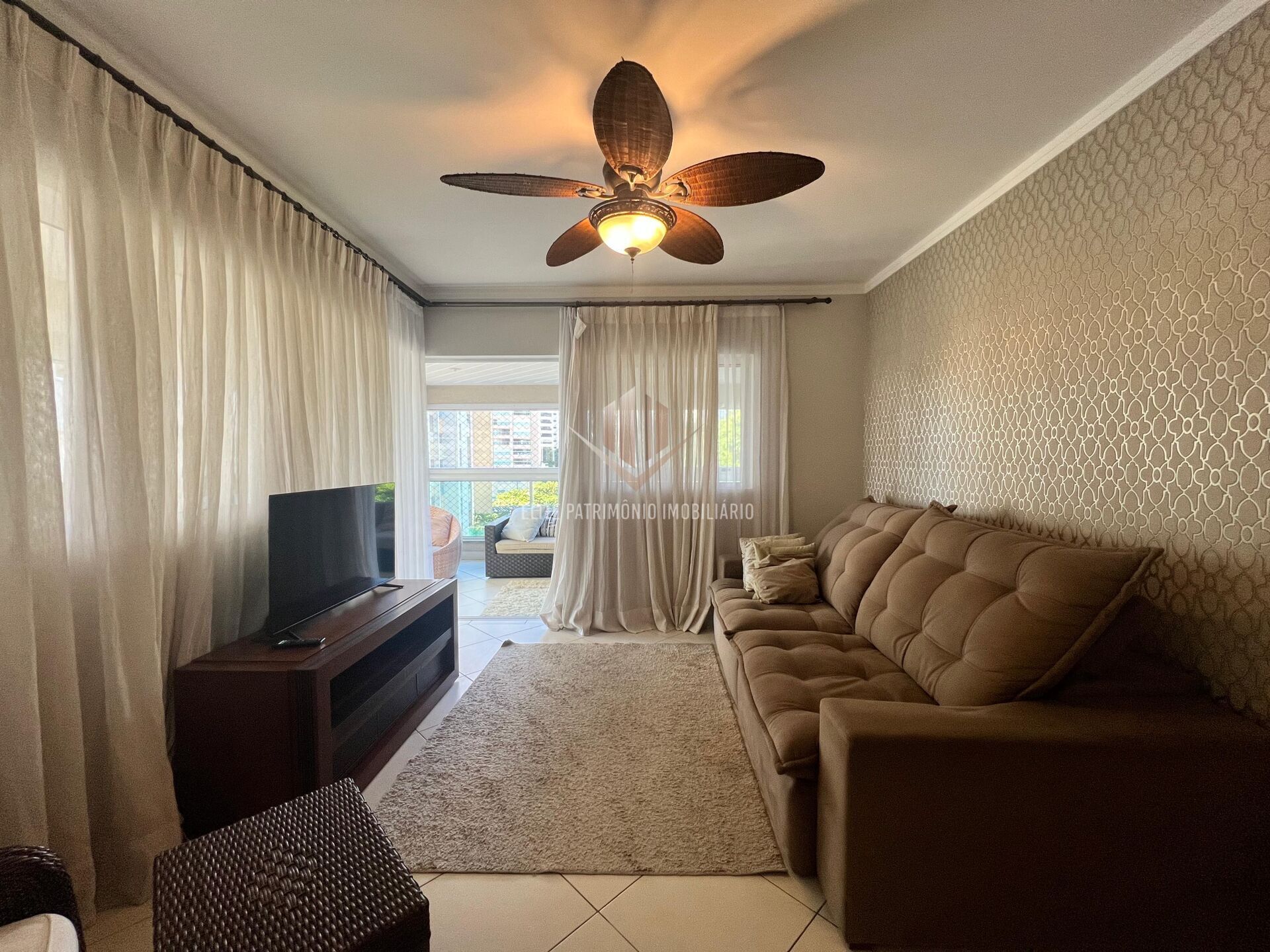 -Sacada gourmet integrada à sala com fechamento em vidro e persianas elétricas;