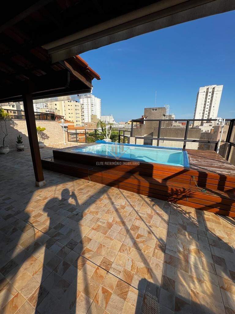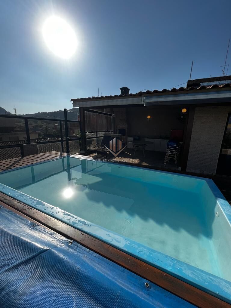 A cobertura oferece um espaço amplo, com churrasqueira e piscina.